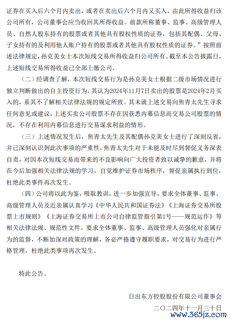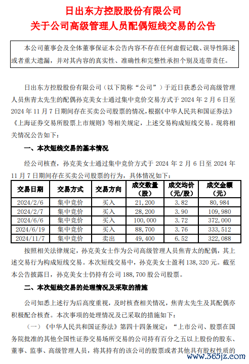 11月29日,20天15板日出东方公告称,公司高级管理人员焦青太的配偶孙克美于2024年2月6日至2024年11月7日期间,通过集中竞价交易方式买卖公司股票,构成短线交易。孙克美在上述交易中盈利138,320元,截至公告披露日,仍持有公司188,700股股票。公司已按照法律规定,全国前三配资平台将孙克美本次短线交易所得收益全部上缴公司。焦青太及其配偶进行了深刻反省,并表示将加强相关法律法规的学习,杜绝此类事件再次发生。公司也将以此为鉴,进一步加强宣导,要求全体董事、监事、高级管理人员及近亲属认真学习相关法律法规,强化对亲属行为的监督。