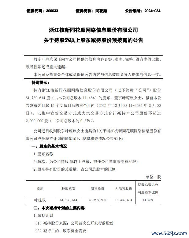 同花顺(300033)11月29日晚间公告,持有公司11.48%股份的股东、董事叶琼玖拟15个交易日后的3个月内,以集中竞价交易或大宗交易方式,杠杆配资官网合计减持公司股份不超过200万股,不超公司总股本的0.37%。