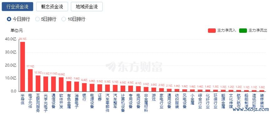 行业资金方面,截至收盘,半导体、电子元件、互联网服务等净流入排名靠前,其中半导体净流入38.06亿。