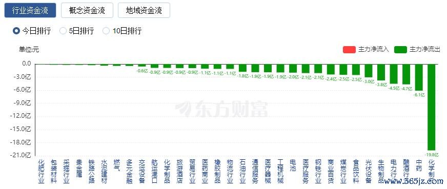 净流出方面,化学制药、中药、酿酒行业等净流出排名靠前,其中化学制药净流出19.78亿元。