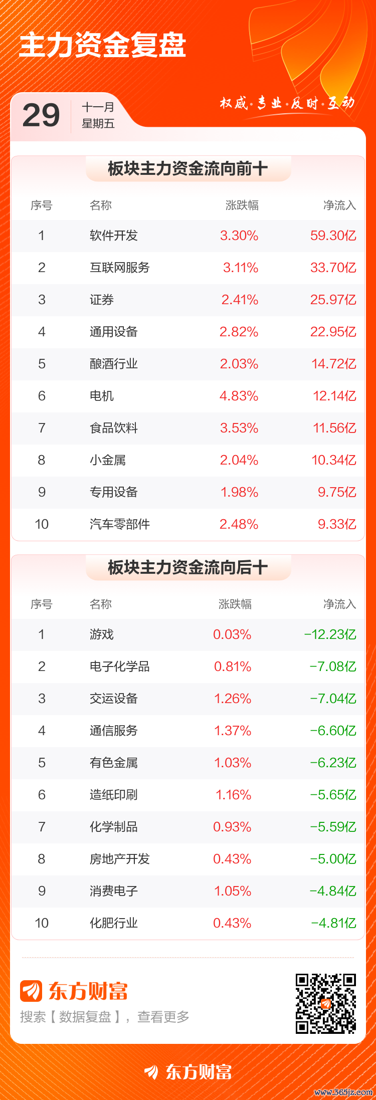 11月29日,沪指涨0.93%,深成指涨1.72%,创业板指涨2.5%。两市成交额1.71万亿,较上个交易日放量2179亿。数据显示,今日大盘主力资金净流入138.69亿。软件开发、互联网服务、证券等板块主力资金流入排名居前,其中软件开发净流入59.30亿元。